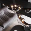 Luminaria de suspender inspirada en las gotas de rocío que brillan sobre una fina brizna de hierba con sus detalles precisos. Iluminados por una fuente de luz interna que ofrece una experiencia estética excepcional, los objetos de cristal, con toques de iridiscencia, se adhieren firmemente a bandas cosidas a mano con un material innovador. La Colección Dew Drops te sorprenderá por sus variables posibilidades de instalación y la opción de crear composiciones únicas en el espacio. El resultado es siempre una instalación distinta y artística, la pieza central brilla desde todos los ángulos del interior.