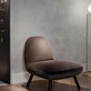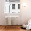 Lámpara de pie de luz difusa. Estructura en latón, cepillado y barnizado transparente o acero cromado. Difusor de vidrio soplado opal. Atenuador en el acorde de potencia.