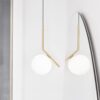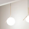 Artefacto de iluminación suspendido con luz difusa. Estructura de latón, cepillado y lacado transparente o acero cromado. Difusor opalino de vidrio soplado.
