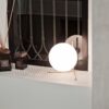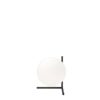 Lámpara de mesa con luz difusa. Estructura de latón, cepillado y lacado transparente o acero cromado. Difusor opalino de vidrio soplado. Regulador de luz presente en el cable de alimentación.