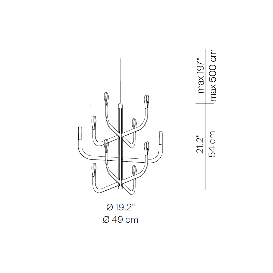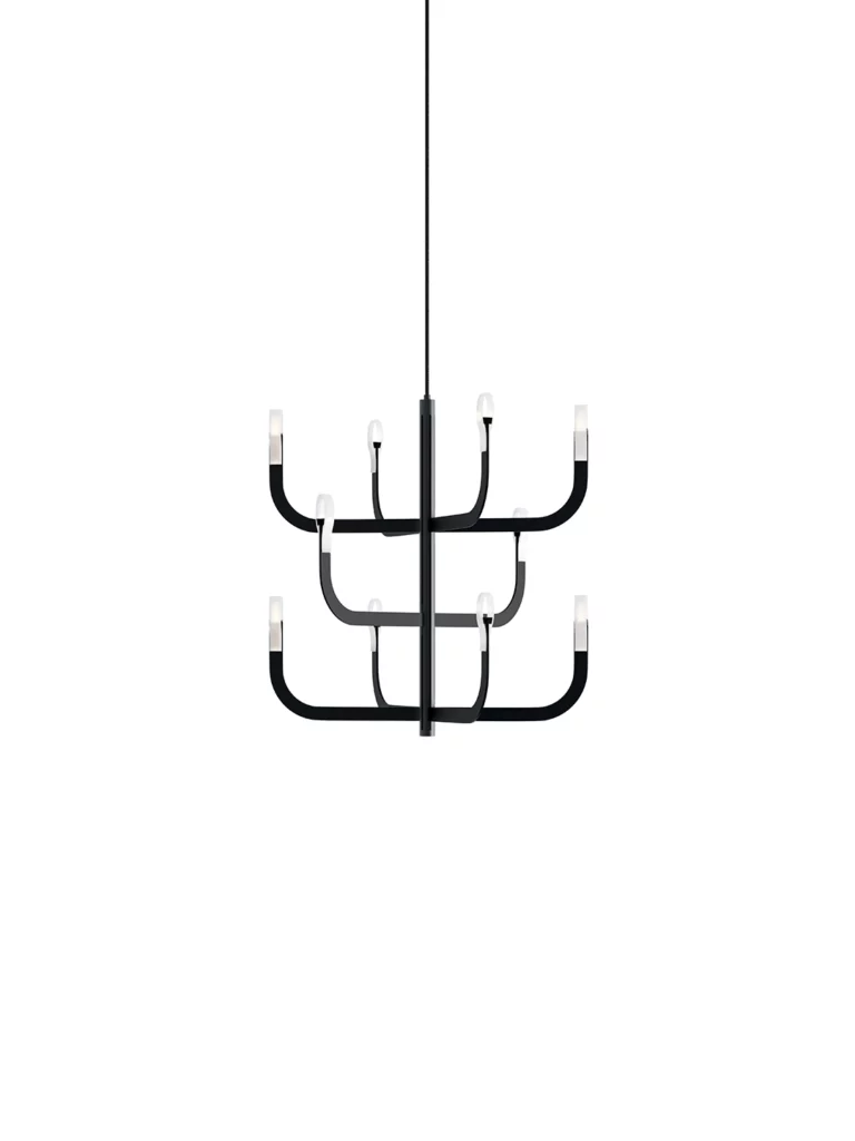 J-US nace de una interpretación inusual de la lámpara de araña tradicional con brazos, donde la innovación tecnológica y la investigación en materiales quedan completamente ocultas. Su cálido y extraordinario rendimiento luminoso, junto con su diseño ligero y dinámico, de gran atractivo visual, confieren a las estancias un tono refinado sin sobrecargar la imagen.