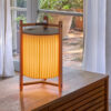 Las lámparas Kando emiten una luz cálida y acogedora, filtrada a través de una cinta para interiores o un cordón náutico para exteriores, materiales que conforman su pantalla. Esta se sostiene dentro de una estructura ligera de madera de teca, que también funciona como asa para un fácil transporte.