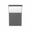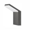 Aplique de pared para exterior. De morfología sintética, se caracteriza por el plano inclinado sobre el cual se encuentra la fuente lumínica que garantiza que la luz alcance no solo la superficie sobre la cual está aplicado, sino que todo el ambiente en general. Protección IP 54.