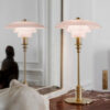 Basada en el sistema reflectante de tres pantallas de Poul Henningsen, esta luminaria proporciona una luz suave dirigida hacia abajo, mientras emite un brillo maravilloso. Las pantallas de vidrio opalino soplado a boca de color rosa pálido son brillantes en la parte superior y, en combinación con un lado inferior blanco ópalo mate pulido con chorro de arena, producen una luz suave y poética.
