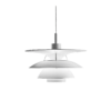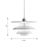 La pantalla superior en forma de trompeta de la luminaria ilumina el área por encima de las tres pantallas, que principalmente dirigen la luz hacia abajo. Un reflector de base y un anillo antideslumbrante azul protegen contra el deslumbramiento desde todos los ángulos. La luz más fuerte está directamente debajo de la lámpara. Las pantallas tienen un acabado pintado en blanco mate para garantizar una iluminación muy cómoda.