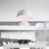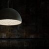 Luminaria de suspensión de iluminación difusa. Difusor semiesférico de yeso colado trabajado mecánicamente, pintado interiormente de blanco. Acabado exterior: óxido, negro brillo, blanco brillo u oro mate. Soporte difusor de yeso en aleación de aluminio fundido a presión, pintado líquido de color blanco. Casquillo superior moldeado en aleación de aluminio fundido a presión, pulido, protegido con pintura transparente en toda la parte vista. Prensaestopas superior y virola de bloqueo en PC (policarbonato) negro moldeado por inyección. Tornillos de ajuste perfilados y galvanizados.