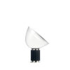 Lámpara de sobremesa de luz indirecta y reflejada. Reflector de aluminio pintado, exterior blanco brillo y interior blanco mate. Difusor orientable de vidrio transparente soplado a boca. Cuerpo en negro mate. aluminio anodizado plata o anodizado bronce. Base en metal niquelado